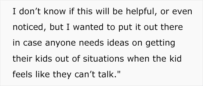 The mother knew she has to get in the car and be on her way to get him, no questions asked and no explanation needed. The story immediately resonated with other community members who wasted no time chiming in with their experiences and applause. Scroll down to find out how the whole story unfolded, and if you have any go-to emojis and phrases your kids can use to discreetly ask for help, we’d love to hear all about them below in the comments.
