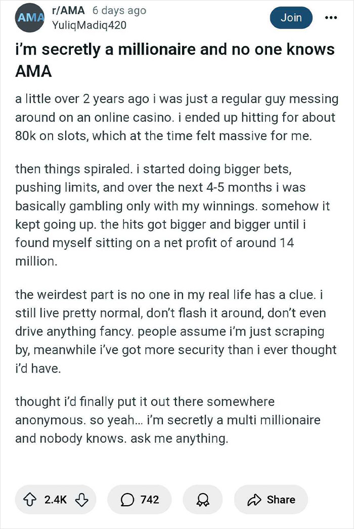 Rather than sharing the news, he chose to keep it entirely to himself. No big announcements to family or friends, no flashy purchases or extravagant luxuries—just life carrying on as usual. But on Reddit, he finally decided to lift the curtain and anonymously answer the internet’s burning questions.