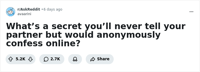Reddit user Avaarini recently posted a question on the platform, asking those in relationships to use the guise of the internet and reveal anonymously what they're too afraid to tell their partners. From true feelings towards their relatives to having zero interest in their hobbies, here are some of the most memorable replies.
