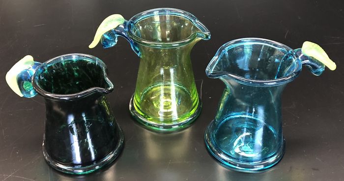 A handle is added to the pitcher with a bit of colored glass. The extra glass is trimmed using diamond shears and a tagliola is used to shape it