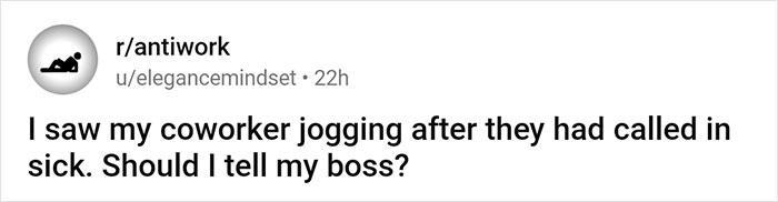 Load More Replies...WTF is it with people snitching on each other? The job doesn't own you. If someone calls in sick, I always mentally add "of work" to the end. To rat someone out to their boss makes you a crappy human. Unless you own the company or are paid to monitor sick time, mind your business. Life is tough enough. It doesn't need you making it tougher.