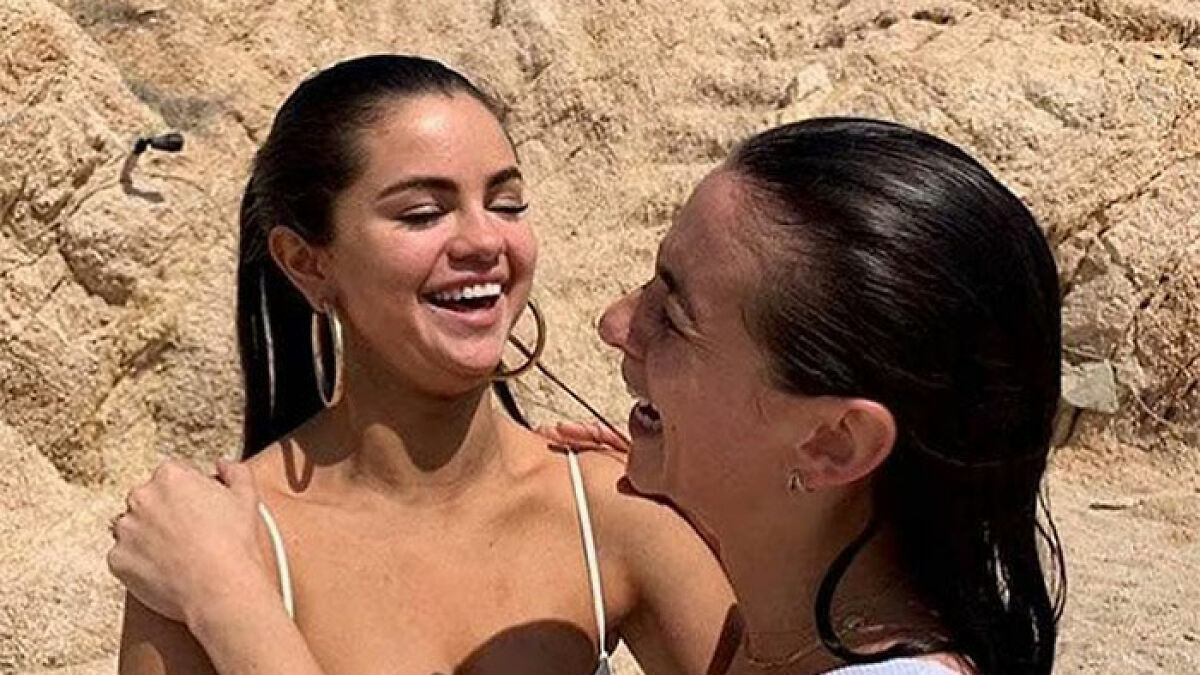 Selena Gomez laughing with a friend on a sandy beach, sparking transplant conspiracy theories online.
