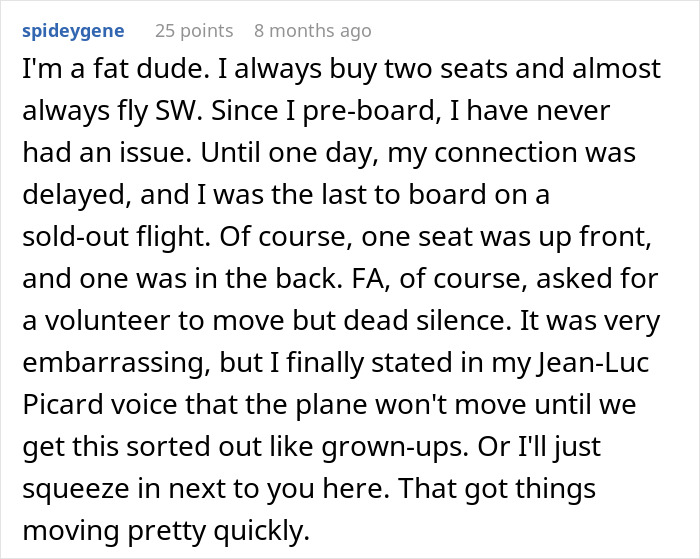 Load More Replies...I find all these 'seat demand' posts interesting. I've taken 18 flights (mostly in the US and UK) in the last 12 months and did not have anyone ask me to move, nor did I hear any exchanges between other passengers. With the frequency BP posts these stories, you'd think it happens every day. Time to find another drum to beat BP.