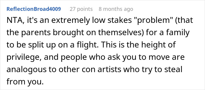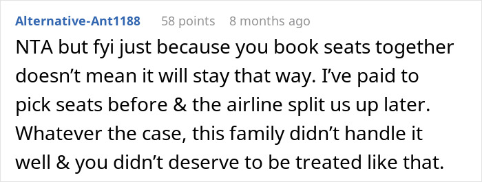 The Redditor reiterated that the family wanting to switch wasn’t the issue. “It was the third party and his attitude. I think solo female travelers are asked to switch seats more often than men are, which I think speaks to a larger issue of certain people feeling that women can be coerced and do not deserve the same respect.”