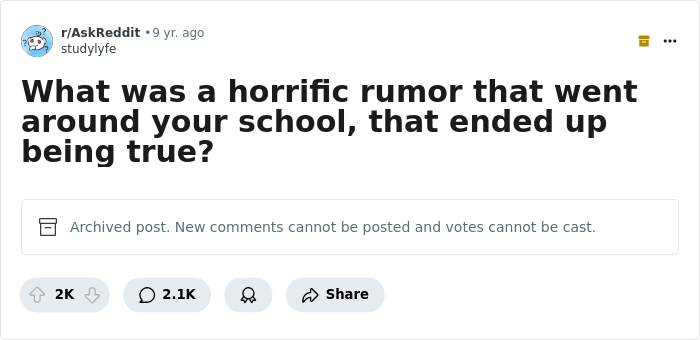 When I was in middle school, the big joke rumor was that two teachers were banging. Years later everyone finds out that not only were they having an affair outside of their respective marriages, but that the male teacher was cheating on BOTH women with a man. The female teacher moved away and ended her own life. The entire situation was unbelievably messy.