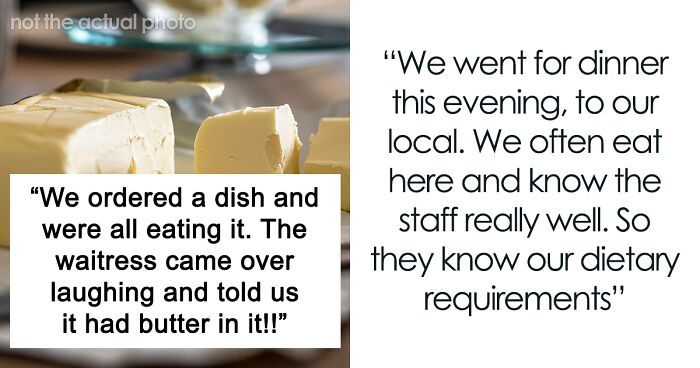 The customer was furious not only because the family was served butter in what was supposed to be a vegan dish, but also because of the way the staff reacted to it. People in the kitchen seemingly hoped that the customer wouldn’t find out what exactly was in their food and the waitress—even though she informed the family about it—found it funny. That made the OP wonder whether the restaurant staff would act the same if it was allergies and not dietary preferences involved.