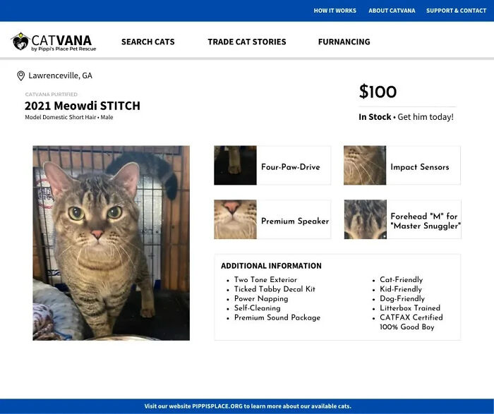 Kayla also was kind enough to share her side of the story regarding the idea behind it. She wrote: “My inspiration for CatVana is humorously uneventful. My husband has been wanting to buy a truck for months and occasionally brings me his phone to show me the listings. On Tuesday morning while I was brainstorming cute ways to display all nine of Pippi's Place's available cats in one post, my husband walked into my office to show me a truck listing. My brain was only half left with the cat work I was doing, so when I saw the year, make, and model of the cars, I thought it would be cheeky to make a post showing the cats as if they were cars. I pulled up the actual CatVana website and modeled the multiple cat listing page off their car search. While I was doing that, different amusing descriptions kept popping up in my head, like the 'four-paw-drive', 'rear air vent', and the rest of them, so I went ahead and made the individual listings as well.”