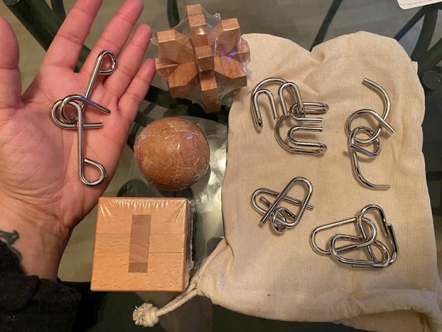 Review: "Absolutely impressed at the durability of this product. The wire puzzles are made of strong wire, and not easily bendable at all. The thickness of the wire ensures these puzzles will be around and in the same condition for many years. The wooden puzzles are beautifully crafted and heat sealed upon delivery. Beautiful boxed packaging and there is a neutral canvas satchel that comes with to house both wire and wooden puzzles. Includes a key to solve both wire and wooden puzzles. Price point is perfect and this is truly a wonderful gift." - Candi Salazar