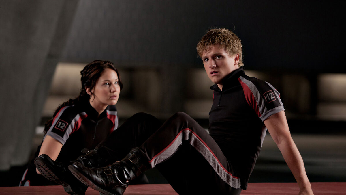 In the first installment, Peeta is partnered with Katniss Everdeen (Jennifer Lawrence) for the 74th Hunger Games. After he is wounded and poisoned, he camouflages himself against a riverbank, surviving for days before Katniss finds him and nurses him back to health.