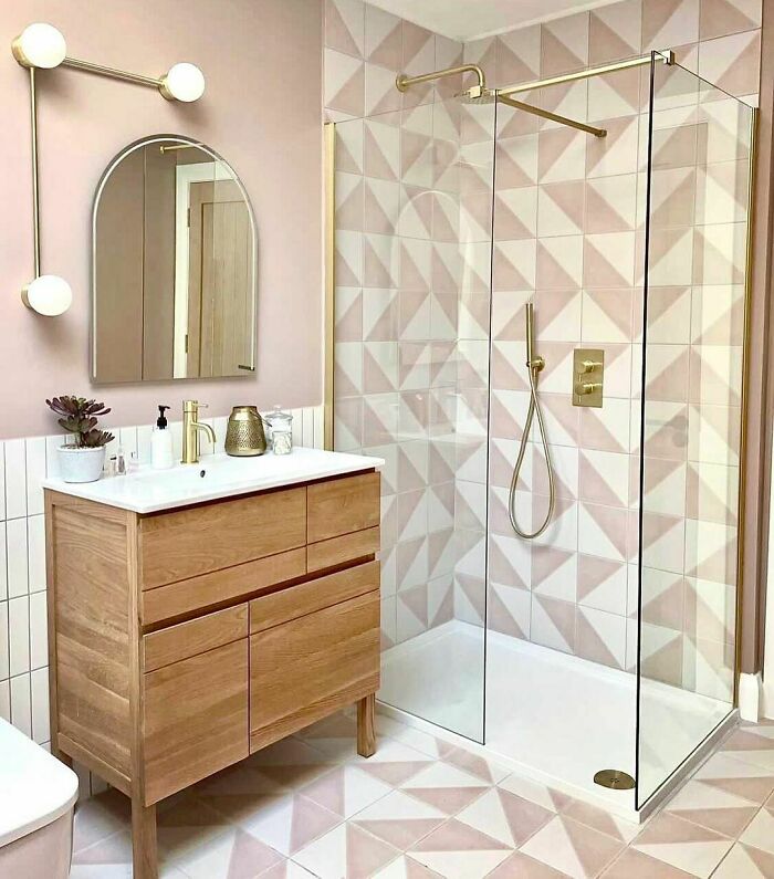 Geometric patterns make for great bathroom shower tile ideas. You can lay them out on the floor or extend them to the walk-in shower. Keep the rest of the bathroom relatively simple and neutral so the patterns don't become too overwhelming. However, that doesn’t mean you can’t add stylish details like gold fixtures or a sculptural light.