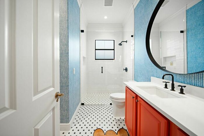 There are several ways to make your small bathroom appear larger, and one of them is by using the same tiles on the shower wall and the bathroom floor. This creates a seamless flow that visually expands the space. Don’t be afraid to use bold patterns, as they also play into the illusion.