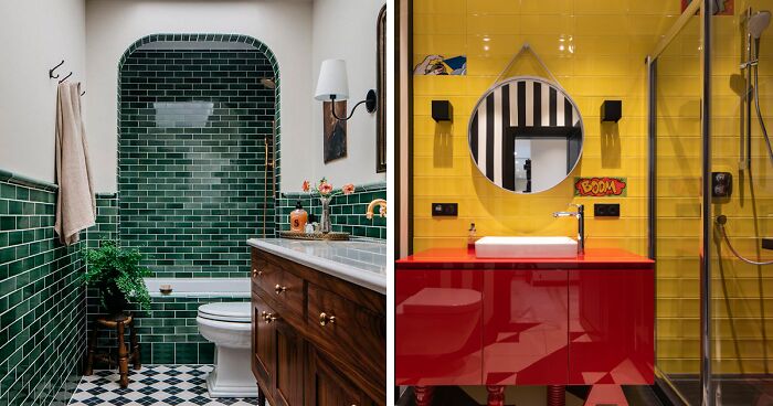 Let’s bring the 1950s back! Recreate the era that was all about colors and whimsy with vividly colored tiles in your bathroom. Go for bright yellow, pink, or turquoise tiles on one wall and playful stripes on the other, and seal the effect with a bright red glossy cabinet to make a final statement.