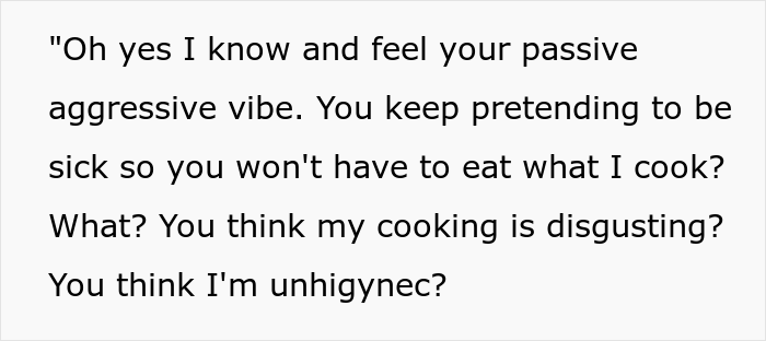 Apparently, for some reason, the MIL took it personally, so she could not find anything better than to write to her daughter-in-law everything that she thought about her. And these thoughts were extremely offensive and negative. The OP’s husband’s mother stated that she simply “knows and feels her passive aggressive vibe”, was offended that she considered her cooking “unhygienic”, and after that, she smoothly moved on to direct insults.