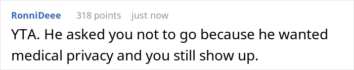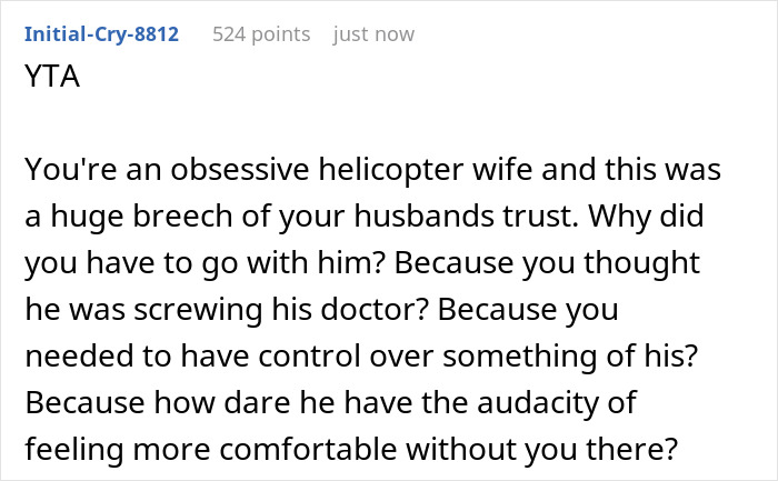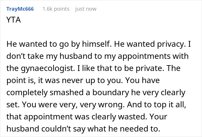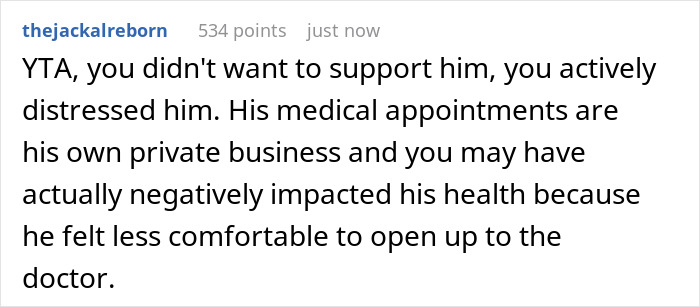 According to some commenters, the wife is really manipulating words in this situation, not really wanting to support her husband, but actively distressing him. After all, as people think, his medical appointments are his own private business and the woman may have actually negatively impacted his health as he felt way less comfortable to open up to the doctor in her presence. “You weren’t there to be supportive him, you were there to be nosy,” commenters state.