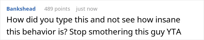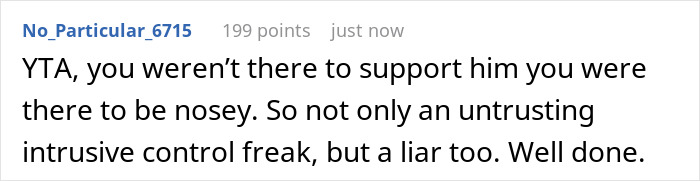 It must be said that the vast majority of commenters also agree with the expert’s opinion, believing that the wife doesn’t have the right to invade her partner’s privacy after he requested to go alone. According to people in the comments, a signed piece of paper doesn’t give her the right to stalk her spouse. “You have zero respect for him, obviously,” one of the commenters simply wrote.