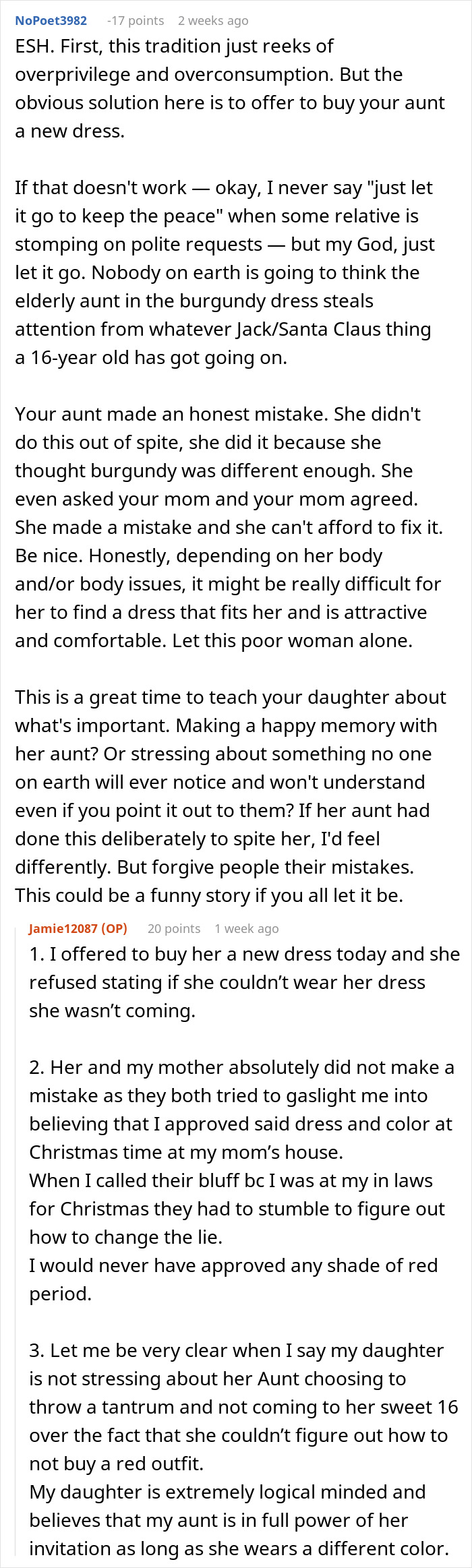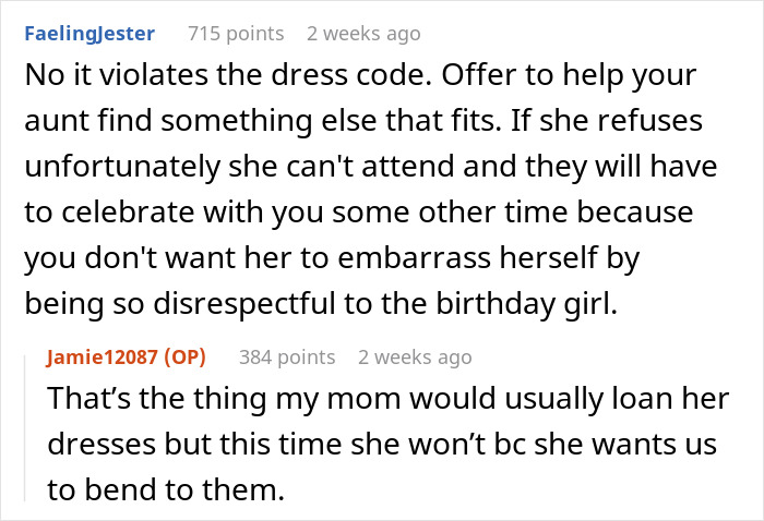 Load More Replies...I don't care whether the party seems "too big for a mere birthday" or if "the rule is stupid". There's no reason to break it, and if the aunt thinks she dies if she wears a different dress, then for goodness sake, she can stay away. I have it up to here with these "I ignore your rules and gaslight you later" freaks.