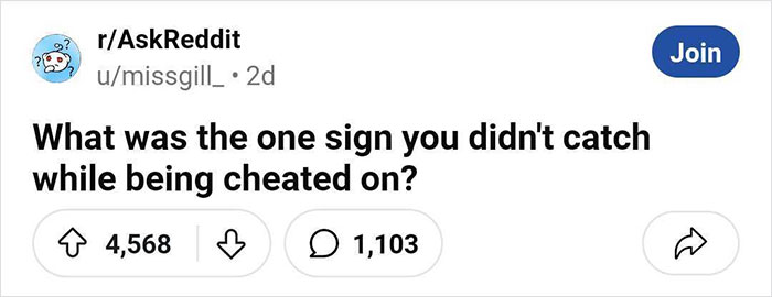 But even when you view your partner through rose-colored glasses, it’s important not to allow blind spots to form in your relationship. Redditors have recently been discussing the red flags that they either missed or chose to ignore while they were being cheated on, so we’ve gathered some of their most heartbreaking stories below. No one ever wants to imagine that their partner could betray them, but if you do find yourself in that situation, you’ll want to notice the writing on the wall.