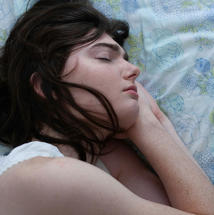 Young woman lying in bed, looking at her phone with a slight smile, showing subtle signs of pulling away in a relationship. She was sleeping with her phone under her pillow.