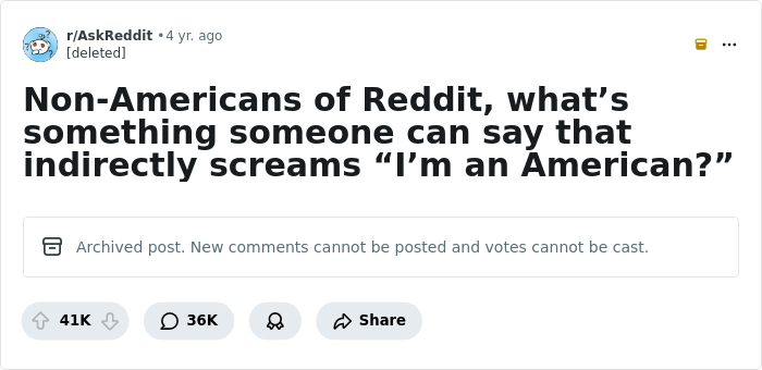 When they’re seeking help on Reddit and their country/region is a required piece of information for the particular question, they usually don’t specify that they live in America. They just assume everyone else in the sub is American. I think I’ve never seen any individual from any other nationality do that.