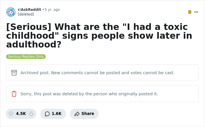 There are many threads on the Internet, the authors of which ask netizens similar questions. For example, "What are the 'I had a toxic childhood' signs people show later in adulthood?" or "What is a small sign that someone had a difficult childhood?" - and every time, there are several thousand people actively participating in the discussions, coming up with their own ideas.