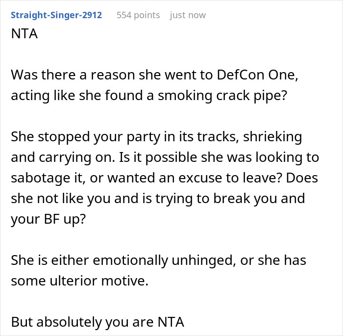 According to some commenters, the OP’s probable SIL looks like a drama queen. After all, it wasn’t a sex toy or condoms that she saw, and the tampons were not used. “To me this is no different than someone freaking out over seeing a box of toilet paper sitting out in the bathroom,” another person in the comments wrote. In any case, this is the OP’s house, and her own bathroom, so it was the guest who showed huge disrespect to the hosts in this situation, the commenters are pretty sure.