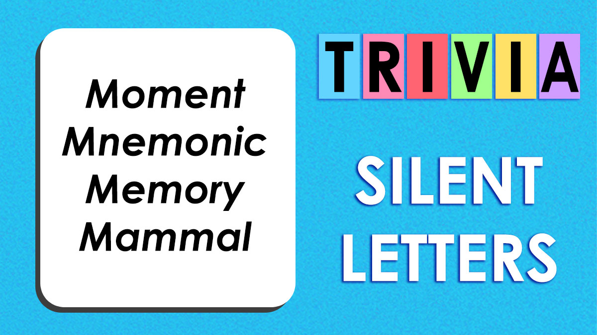 Trivia card showing words with silent letters including mnemonic and mammal on blue background with silent letters text