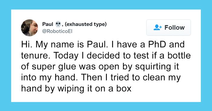 Dr. Paul Bones, an Assistant Professor of Sociology at Texas Woman's University, started up a fun, quirky, and thoroughly honest thread about a recent mistake he made. A mistake involving his hand, some super glue, and a box. Inspired by the Ph.D. (who has tenure, no less!), other highly-educated individuals, real pros in their respective fields, opened up about their own funny fails.