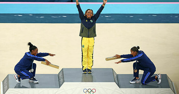 Biles and Chiles, who won the bronze and silver medals respectively, knelt in honor of the South American winner while smiling, sharing in her victory as the audience erupted in applause.