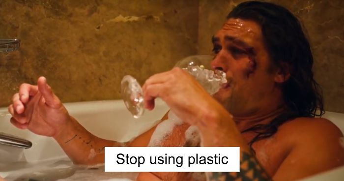 “So please, stop using single-use plastic water bottles,” Momoa says, taking another sip of water, and with that, his PSA clip comes to an end.