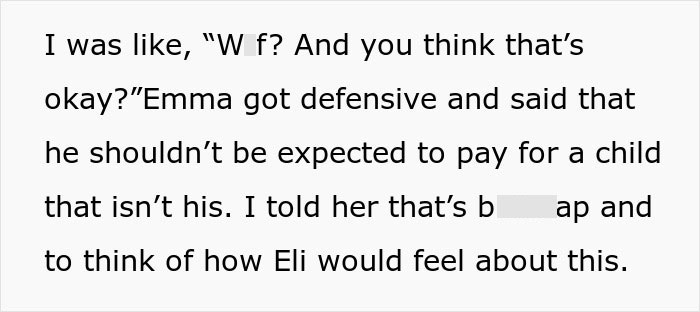 That’s when OP couldn’t stay quiet anymore. She pushed back, saying it was cruel to exclude Eli and that being a stepfather means stepping up. Emma, however, defended her husband, claiming he wasn’t obligated to spend money on “a child that isn’t his.” That’s when the gloves came off—OP let her sister know she was being a lousy mom.