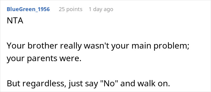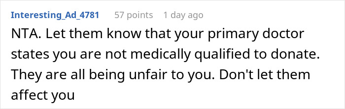 Her parents keep calling her selfish and saying she’s letting her brother die just because of a grudge, but Jake hasn’t even tried to apologize or reach out to her himself. OP says of course he’s her brother and she loves him but her own health isn’t the greatest and she worries about the negative impact the procedure might have on her, too.