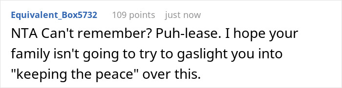 We are often kind enough to forgive others and ourselves for their mistakes in order to move forward and grow. It is probably this kind of acceptance that Oscar Wilde had in mind when he insisted every saint to have a past and every sinner to have a future. However, letting go of the misdeeds without a person taking responsibility, acknowledging they did us wrong and are willing to change might mean indulging such behavior and enabling them to keep on hurting us, so it is only fair that we refuse to play along and and refuse to “forget”. As did this Redditor when she met her high school bully at a family dinner.