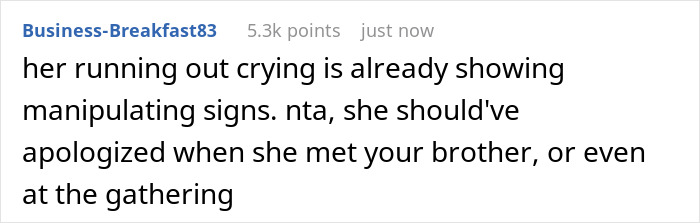 Load More Replies...She obviously remembers. The bullying took place in high school, for years, and they are in their mid-twenties, it's not like it was one single comment happened 70 years ago, c'mon. And if she was changed she would have apologized. How hard that would be? "Hi, yes I recognize you, I know I bullied you for years, but I fully regret it and I sincerely apologize. I really love your brother and I hope we can all get along" of something like this. Instead she immediately cried. Uhm, ok drama queen. No, she knows, she remembers, she still doesn't care. For her brother's sake, I hope they don't get married, she seems an awful person.