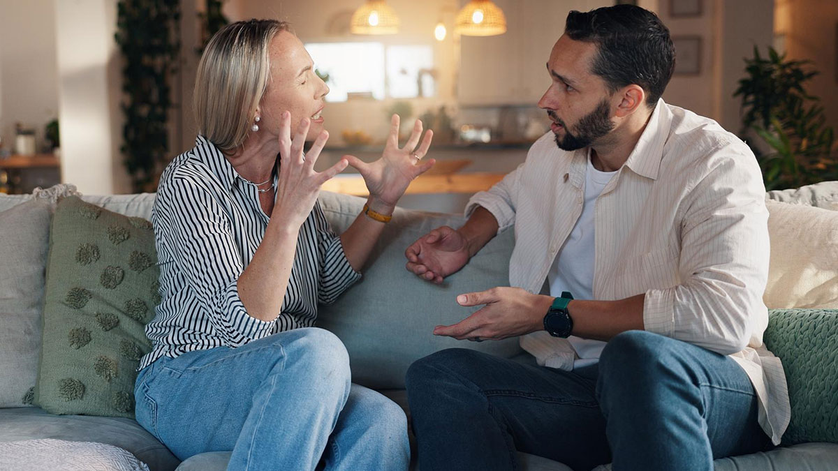 Couple having a heated discussion on couch, highlighting sister relationship cheater tension in a home setting.