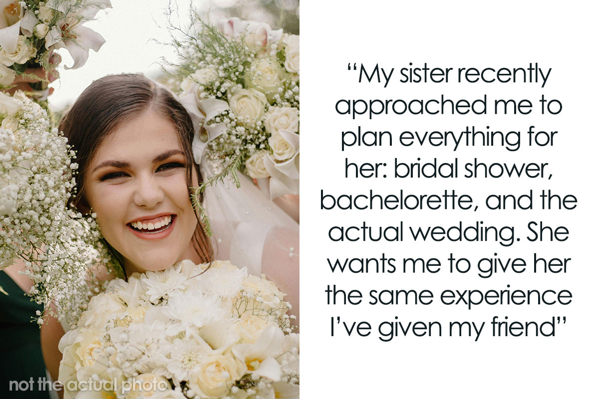 The sister asks the woman to plan her entire wedding plus the bachelorette party for free, but refuses to allow her to be part of her bridal party as she doesn’t have the right “look”