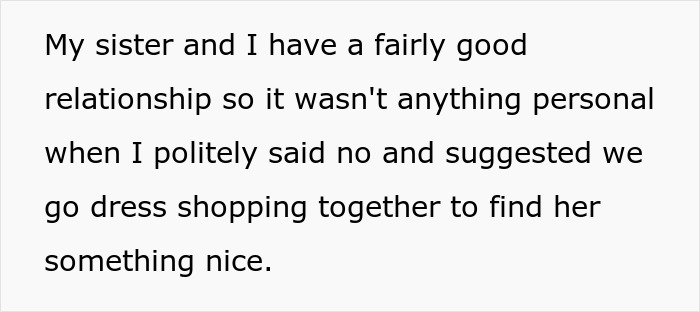 The OP also explained that she has a very good relationship with her sister, but, despite that, she didn’t want to lend her the wedding dress. She instead offered to go dress shopping so that they could bond over that. But this did not seem to pacify the sister, who kept demanding to borrow the dress.
