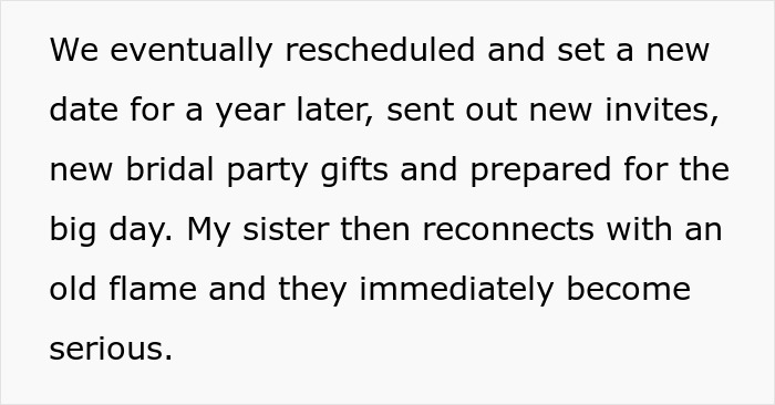 The wedding, however, went well. Yes, the bride’s side was one short, but practically no one paid attention to this. When getting into the newlyweds’ truck, though, the OP’s husband suddenly showed her sister’s post on Facebook, where she exposed herself with her boyfriend at a rather expensive resort, and also talked about their upcoming wedding venue. This was such a shock to the Original Poster that she literally blocked her sister on all platforms, and when she sent her wedding invitation, just threw it away without even reading it.