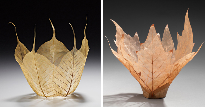 Ethereal bowls made from the skeletons of maple and other leaves are the latest addition to Japanese artist Kay Sekimachi’s impressive portfolio. While she is most famous for her labor-intensive loom works, Sekimachi creates these sylvan masterpieces by adding Kozo paper, watercolor and Krylon coating to the leaves, giving them solid form.