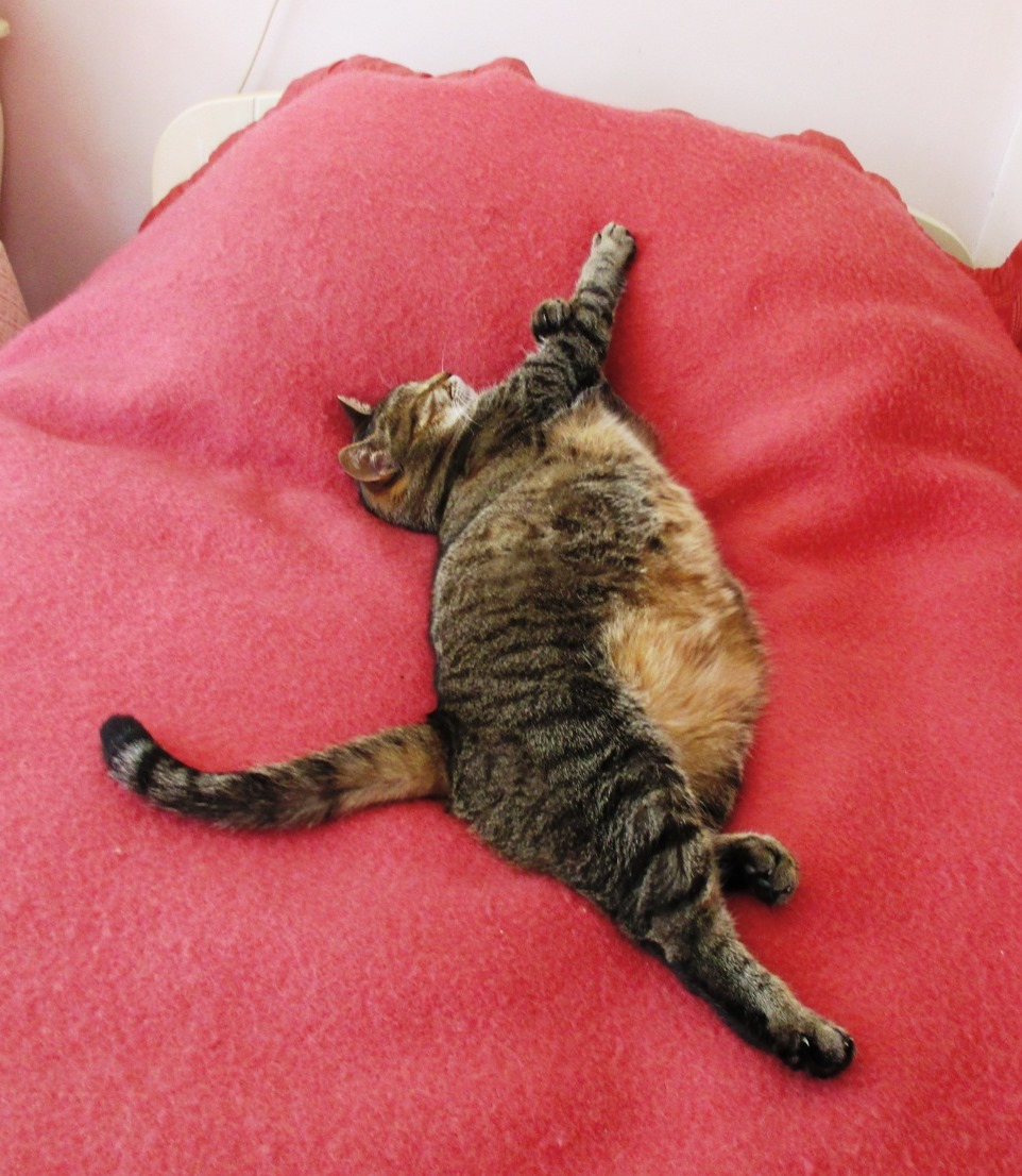 There are cats who love sleeping on the side or curled up and that’s really cute but one of our absolute favorite sleeping cat positions is when they lay flat on their back with their legs straight almost looking like a human! And one orange and white calico munchkin cat named Chata is actually pretty famous for this.