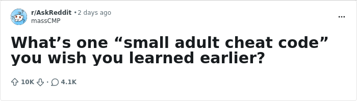 The question that sparked such heated debate is actually quite simple: "What's one 'small adult cheat code' you wish you'd learned earlier?" So today, we, Bored Panda, offer you a selection of just over thirty of the most interesting and sometimes downright unexpected pieces of advice and worldly wisdom from random peeps from across the globe, based on this thread.