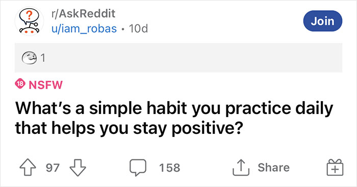 Created by user iam_robas, it asked everyone the question, "What's a simple habit you practice daily that helps you stay positive?" It's not the most popular post on the platform, but the discussion in the comment section provides interesting insights into how people navigate these turbulent times.