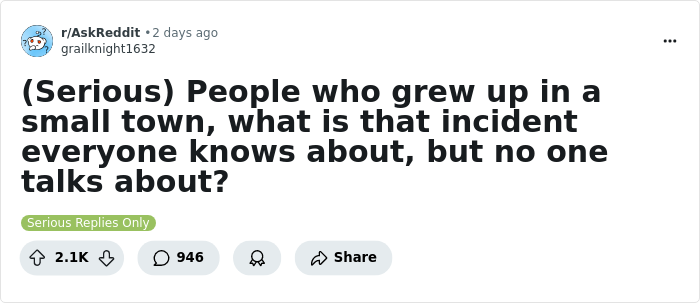 Someone asked “People who grew up in a small town, what is that incident everyone knows about, but no one talks about?” and netizens shared their stories. Be warned, these can get pretty dark. So read through, upvote the most interesting ones and be sure to add your own in the comments section below.