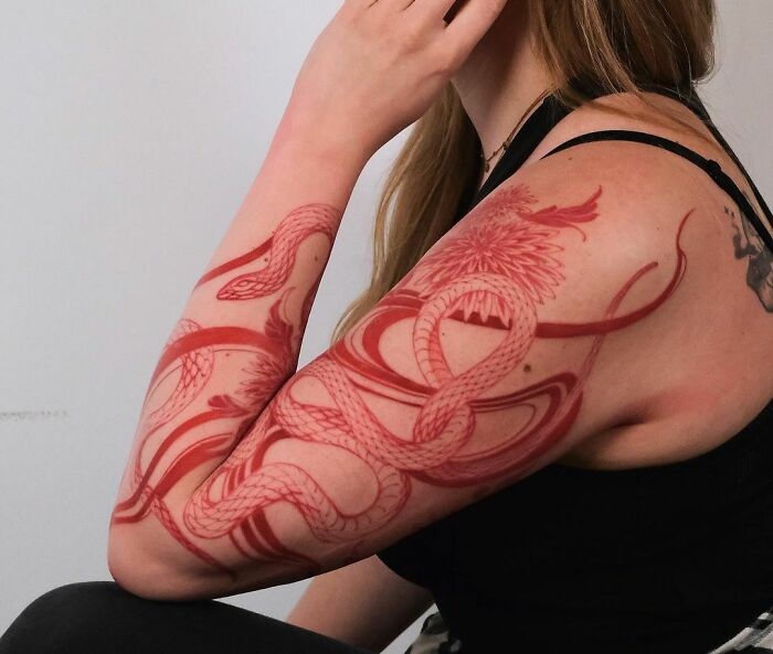 Red snake tattoo design on a forearm, showcasing intricate details and vibrant colors.