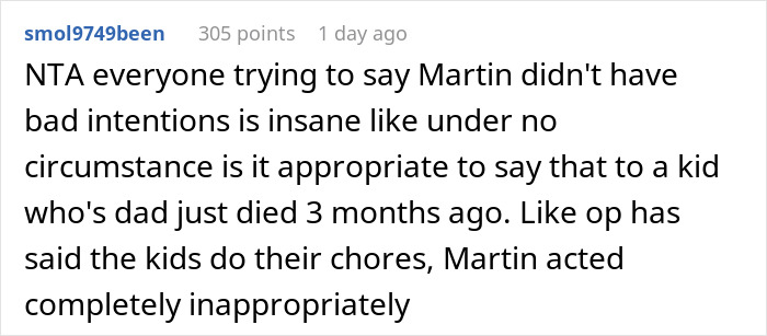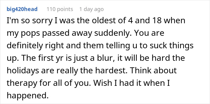 Load More Replies...1/Don’t parent other people’s kids, unless they are on board with it 2/Don’t assume that anyone wants their kids to be brought up the way that their in-laws did it 3/Don’t tell a recently bereaved widow that she’s not doing a good enough job raising her kids 4/Don’t tell a recently grieved widow that she shouldn’t be able to confide in you. If you do one of these things, you risk damaging your relationship with her and the family. If you do all of these things, you risk damaging your relationship with her and the family and it will absolutely be your fault. If you lose touch with your nieces/nephews/grandchildren, it will be your fault. If you do all of these things, and then your family close ranks to tell the grieving mother that it is her fault, you are simply bad people. In addition, the same will be done to you, by the same people, when *you* need help.