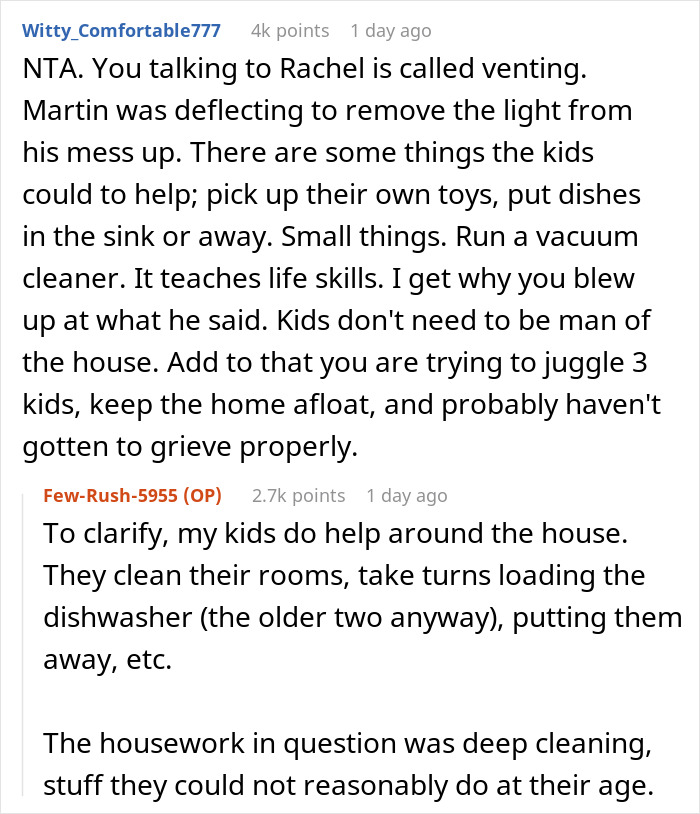 This is so sad. And it's a sad example of children's emotions being dismissed and devalued. The whole family lost their dad. Not just the mom. The kids too. They are all grieving and of course they all need to step up and do more than normal. But still it's horrible to tell a child to 'become the man in the house '. No, they're not a 'man' now, they're still a child and still have a children's needs. They have to come to term with being a half orphan. But they do not need to take the role of a parent. And can we please acknowledge the underlying misogyny of the whole situation? It definitely wasn't his place to single out her only male child to set him up for the toxic idea that he has to regulate his sisters and his own mom! He's not even the oldest child! He's just ten years old for heavens sake. He's not a 'man'by any means and not more capable than his own mother to manage the family just because he's male! Stop that BS