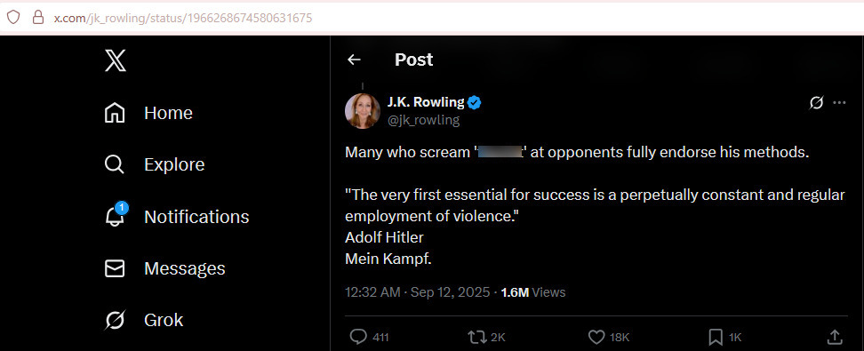 @Forrest Hobbs Quick question, what did you think of her twitter post where she quotes Ad0lf H!tler ? (source - https://x.com/jk_rowling/status/1966268674580631675) Screenshot...nsored.jpg