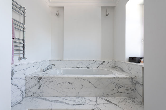 Take a chance on a classic porcelain clawfoot tub with rounded corners. Add paintings to dark walls and a few dried branches in decorative baroque vases. “I’d personally go with Nietzche’s book next to the freestanding bathtub, but you can also add a cartoon book if you like. If that doesn’t set your mood right, give it a try on a rainy day lighting up scented candles,” suggests Endri.