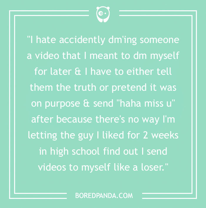 "I hate accidently dm'ing someone a video that I meant to dm myself for later & I have to either tell them the truth or pretend it was on purpose & send "haha miss u" after because there's no way I'm letting the guy I liked for 2 weeks in high school find out I send videos to myself like a loser."
