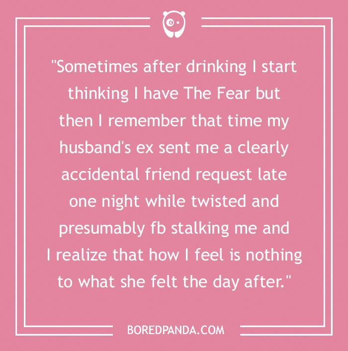 "Sometimes after drinking I start thinking I have The Fear but then I remember that time my husband's ex sent me a clearly accidental friend request late one night while twisted and presumably fb stalking me and I realize that how I feel is nothing to what she felt the day after."