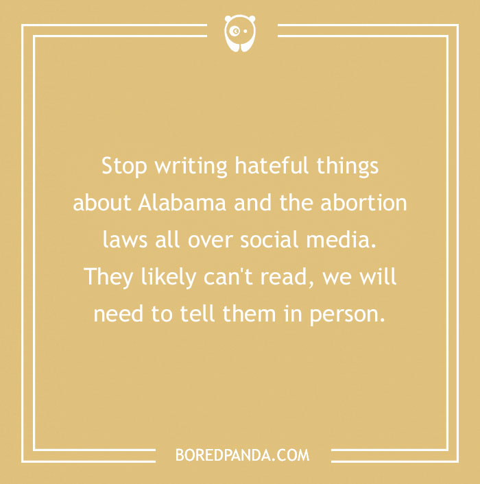Stop writing hateful things about Alabama and the abortion laws all over social media. They likely can't read, we will need to tell them in person.